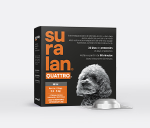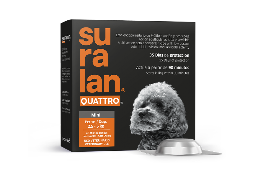 Suralan® Quattro® está indicado para el tratamiento de perros con, o en riesgo de infestaciones parasitarias mixtas causadas por endoparásitos y ectoparásitos, siempre que se requiera una acción simultánea contra pulgas, garrapatas, ácaros, nematodos (incluyendo gastrointestinales, pulmonares, oculares y del corazón) y cestodos (tenias), previniendo además la dirofilariosis y la angiostrongilosis.