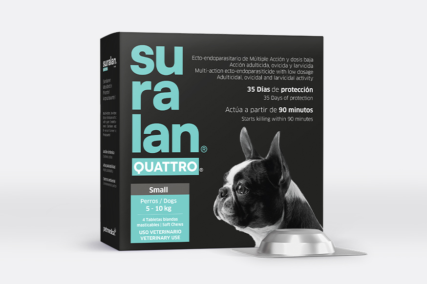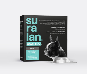 Suralan® Quattro® está indicado para el tratamiento de perros con, o en riesgo de infestaciones parasitarias mixtas causadas por endoparásitos y ectoparásitos, siempre que se requiera una acción simultánea contra pulgas, garrapatas, ácaros, nematodos (incluyendo gastrointestinales, pulmonares, oculares y del corazón) y cestodos (tenias), previniendo además la dirofilariosis y la angiostrongilosis.
