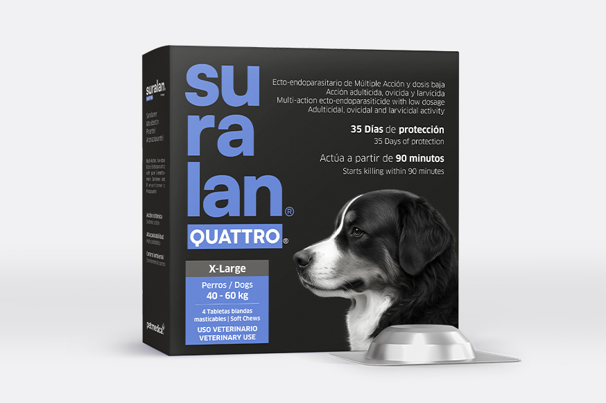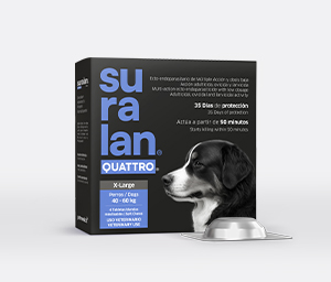 Suralan® Quattro® está indicado para el tratamiento de perros con, o en riesgo de infestaciones parasitarias mixtas causadas por endoparásitos y ectoparásitos, siempre que se requiera una acción simultánea contra pulgas, garrapatas, ácaros, nematodos (incluyendo gastrointestinales, pulmonares, oculares y del corazón) y cestodos (tenias), previniendo además la dirofilariosis y la angiostrongilosis.